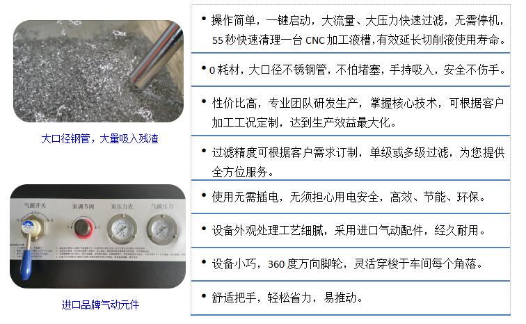 2、用過濾的沙漏進行打撈,處理效率低,切削液在處理過程中容易灑漏,濺到皮膚,引起皮膚過敏,且會造成切削液浪費。